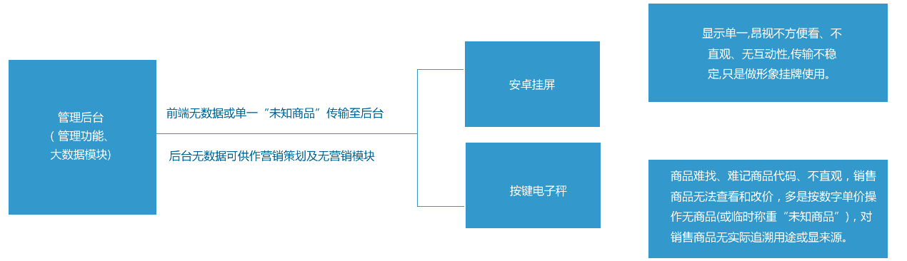| 2.2 | 收銀前端操作 | 按鍵稱重,無法顯示,消費(fèi)不透明、不直觀、隨意性強(qiáng)、缺斤少兩難以杜絕;同時(shí)也造成商戶當(dāng)作普通電子秤使用,無法采集到任何銷售數(shù)據(jù),跟傳統(tǒng)電子秤購買沒有任何區(qū)別(浪費(fèi)投入)。 | 操作簡單點(diǎn)圖稱重即可消費(fèi);又能實(shí)現(xiàn)收銀超市化,單品稱重、多品連續(xù)稱重、結(jié)帳、改單、退換貨、掛賬、會員折扣、會員積份、促銷活動、報(bào)損、采購、調(diào)貨等直接操作性強(qiáng);無法違規(guī)操作,杜絕缺斤少兩;消費(fèi)更直觀、更透明、真正做到公平消費(fèi),增強(qiáng)消費(fèi)者信心和體驗(yàn)感。 |